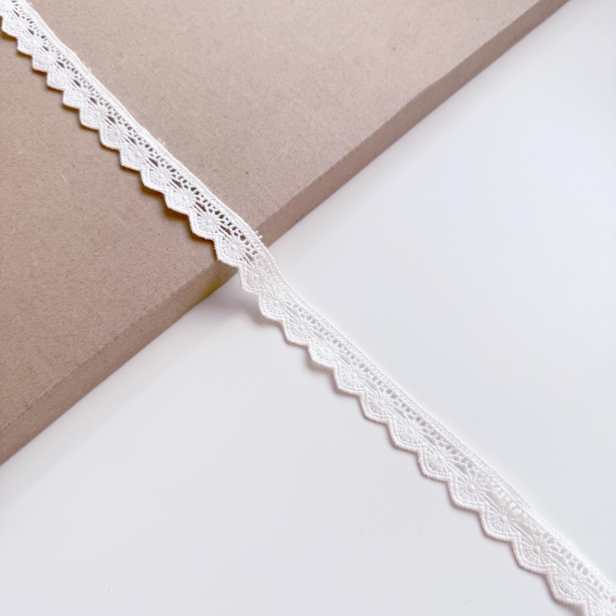 Enhance your crafting and sewing projects with this delicate off-white cotton edge lace trim. Its 3/4-inch width makes it versatile and perfect for adding a soft, elegant touch to any creation.