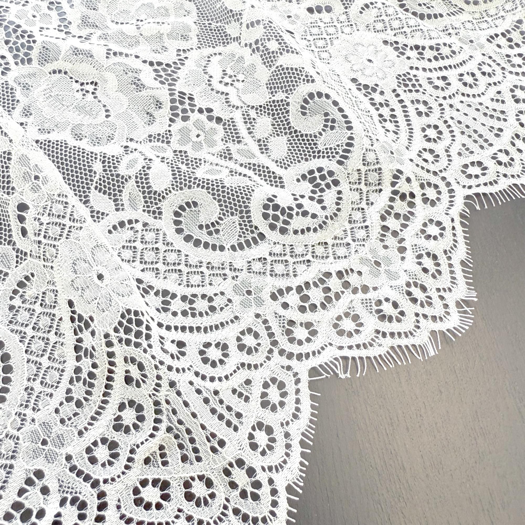 Add timeless elegance and generous coverage to your projects with this beautiful off white scallop floral eyelash lace fabric. Measuring 58 1/2 inches wide at its fullest point, this lace is ideal for bridal gowns, veils, formalwear, and luxurious event decor. Soft eyelash fringe and mirrored floral edges complete the romantic look.