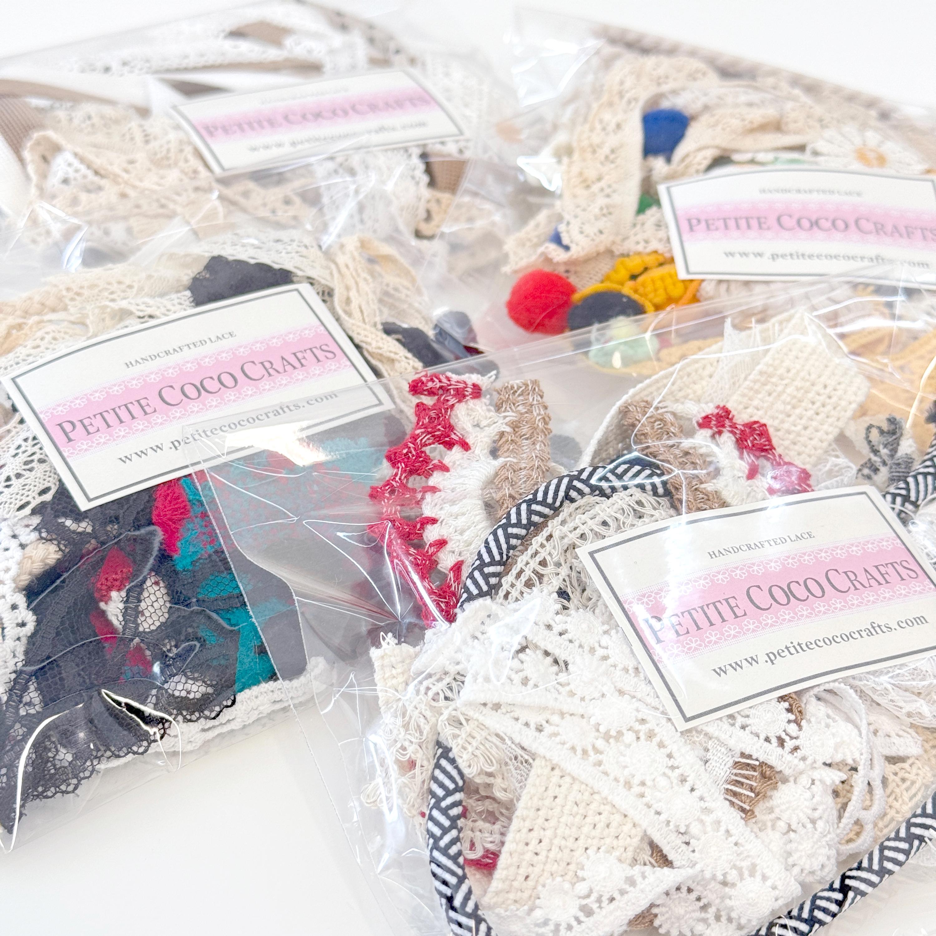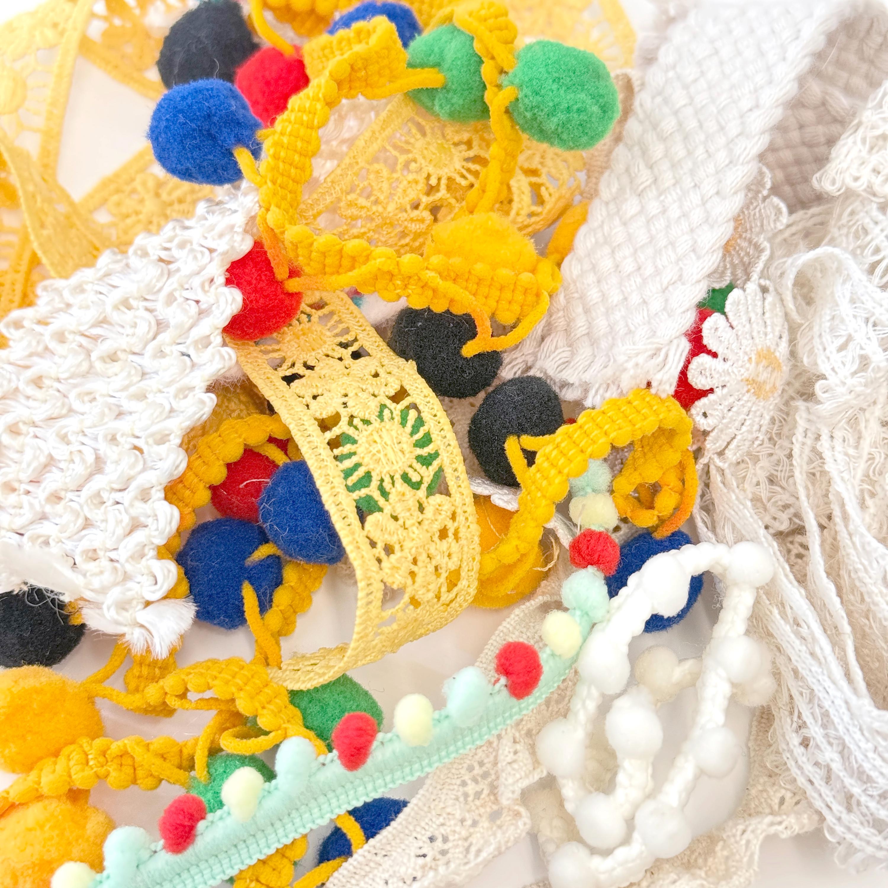 * Assorted Variety: 10 random pieces of mixed trims such as lace, cord, fashion/twill tape, ribbon, pom pom, ruffle, and sequin styles.