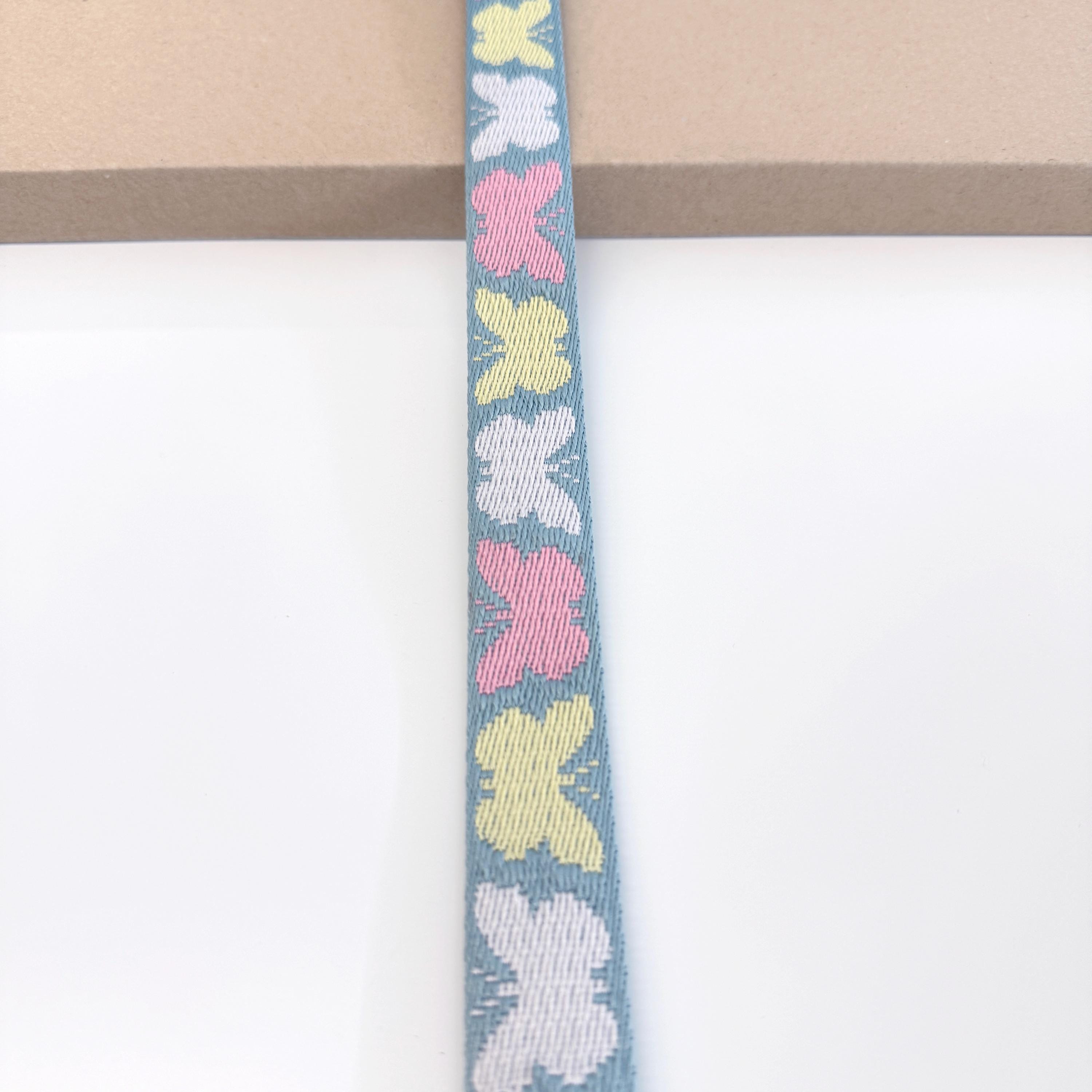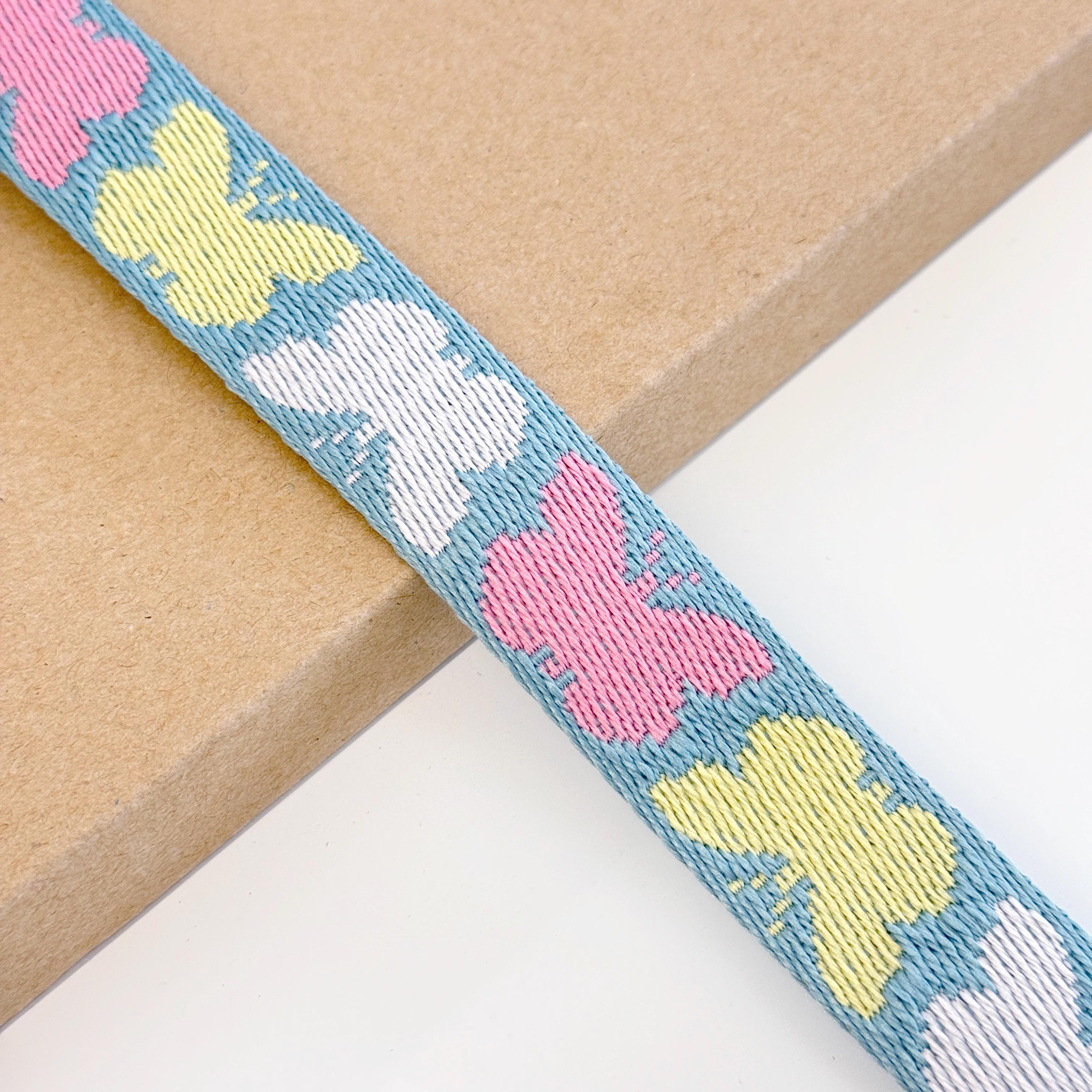 Add a cheerful and whimsical touch to your creations with this Colorful Butterfly Tape Ribbon. Featuring vibrant butterfly patterns on a sturdy woven ribbon, this trim brings life and color to any project. Made from 100% polyester, it’s soft, durable, and easy to work with for both sewing and crafting.