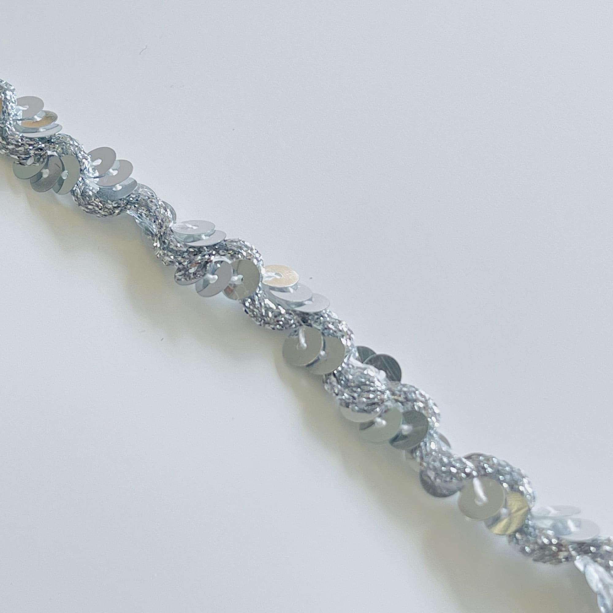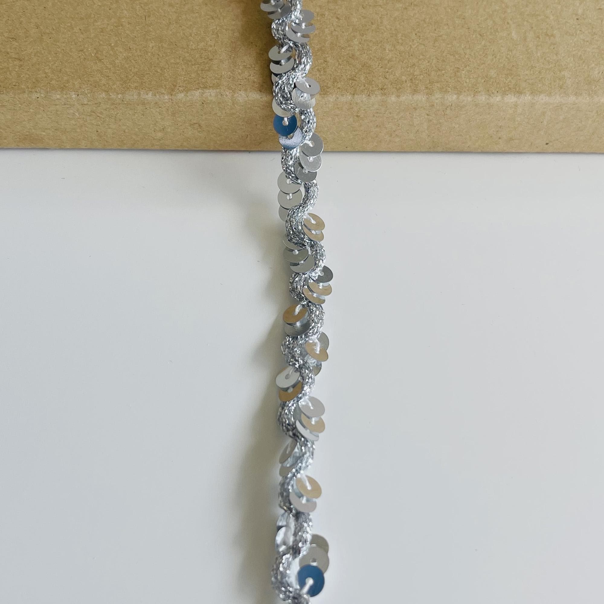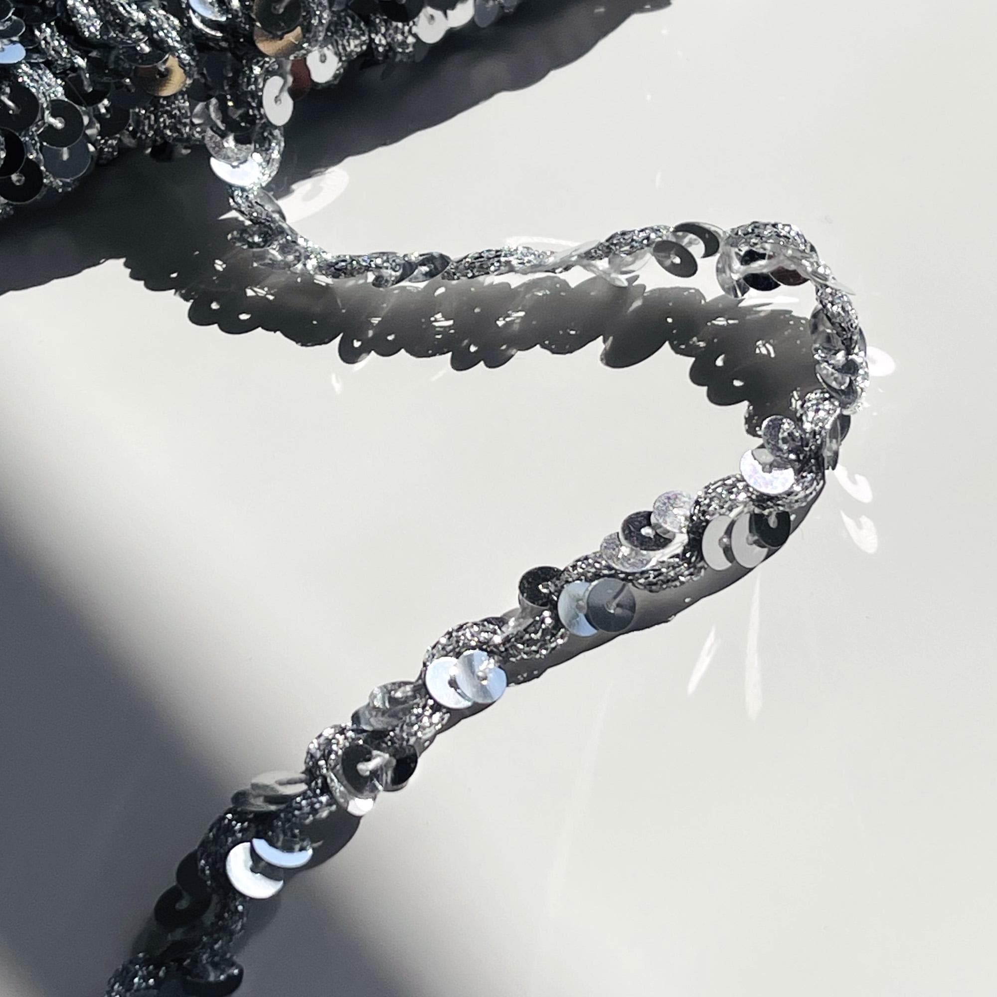 Add sparkle and shine to your creative projects with this Silver Spangle Sequin Trim. Featuring shimmering silver sequins stitched onto a flexible base, this trim is perfect for adding a touch of glamour to garments, accessories, and décor pieces. The 3/8-inch width makes it easy to sew or glue onto various materials, while its stretchable composition ensures both comfort and versatility.