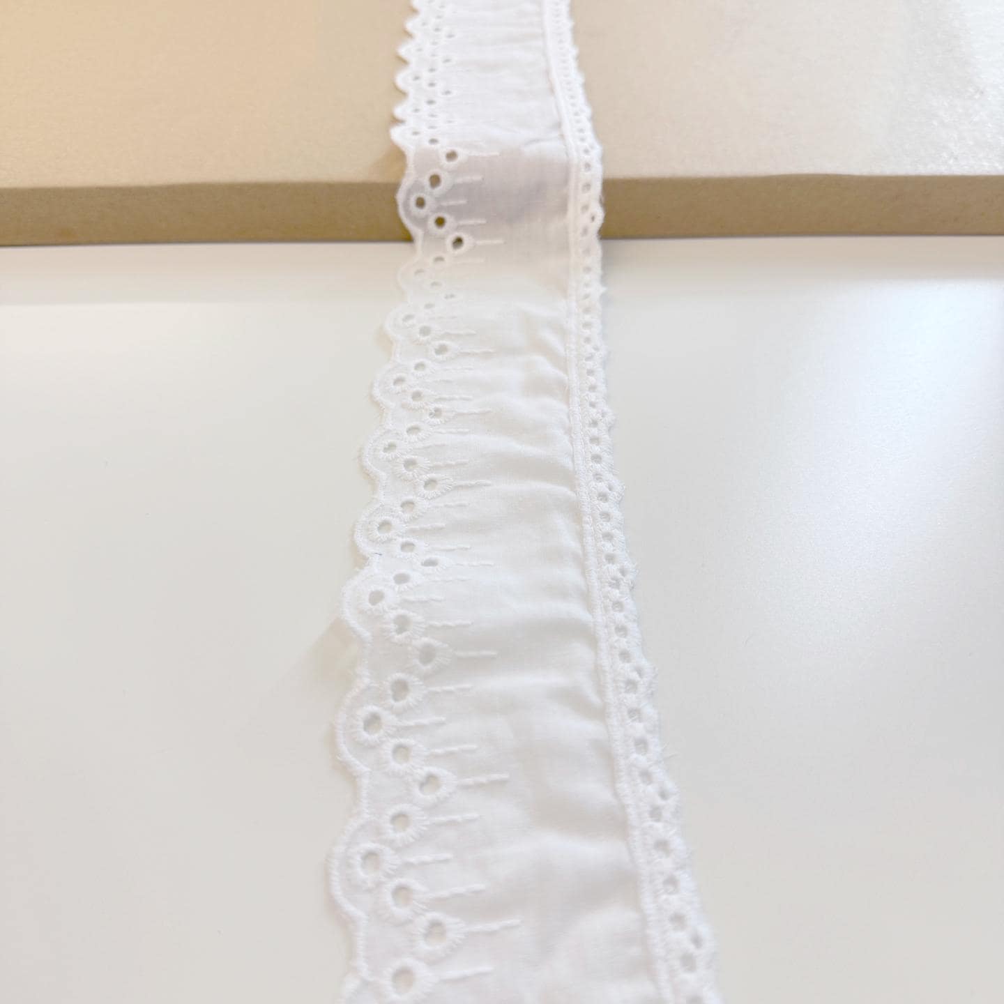 Add a touch of timeless charm to your sewing and craft projects with this Off White Scalloped Eyelet Edge Trim. Crafted from 100% cotton, it features a delicate scalloped edge and intricate eyelet detailing—perfect for classic and vintage-inspired designs.
