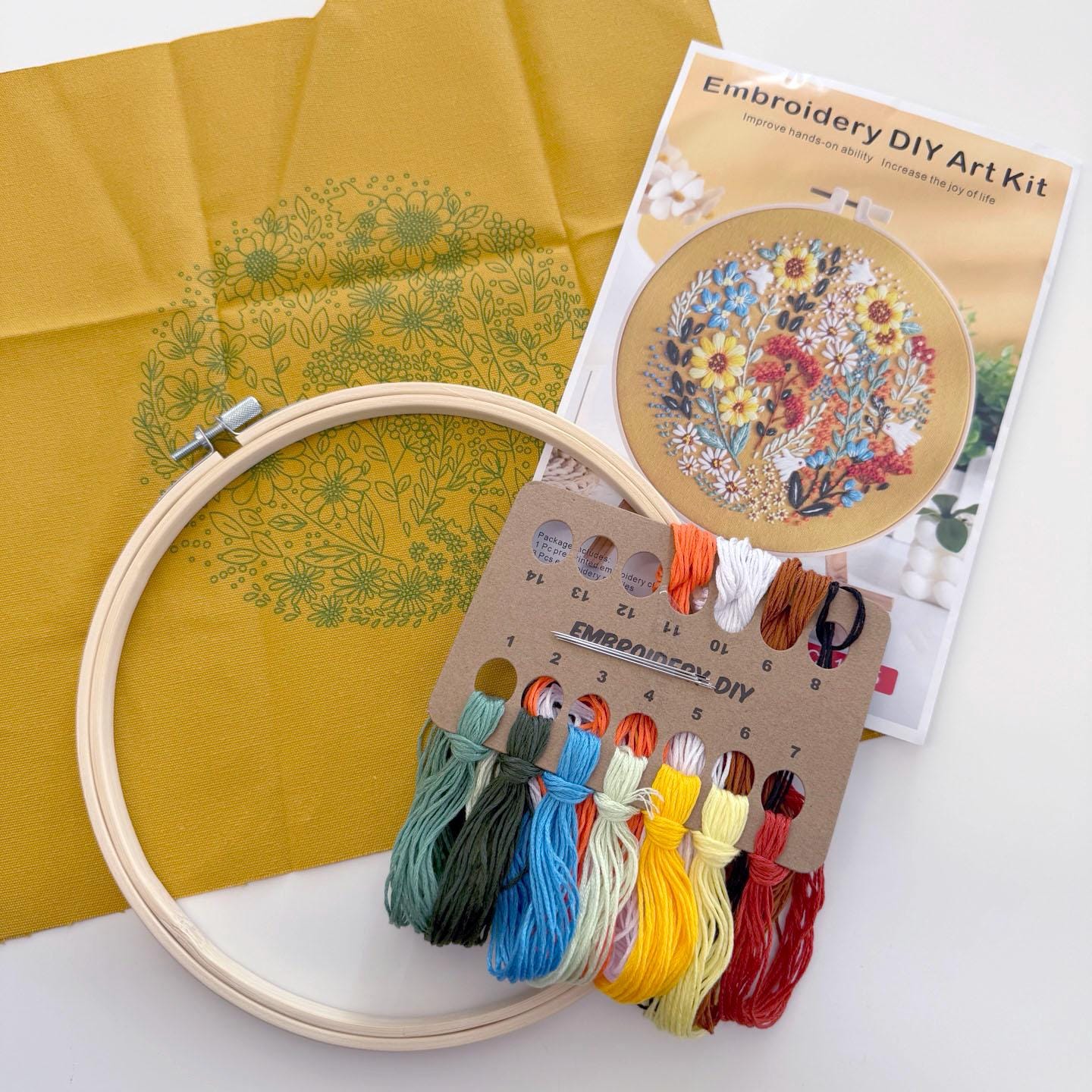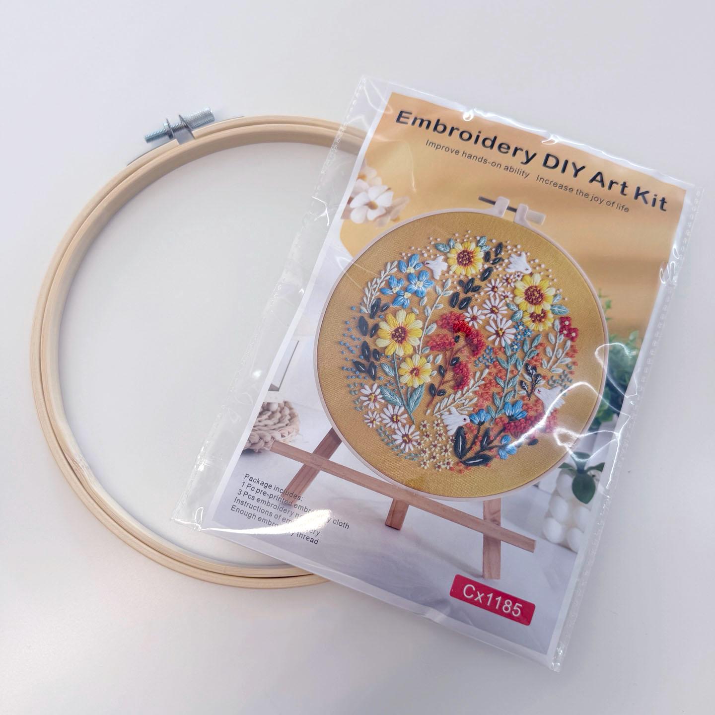 * Complete Starter Kit: Includes printed fabric, embroidery needle, threads, 8" hoop, and step-by-step instructions.